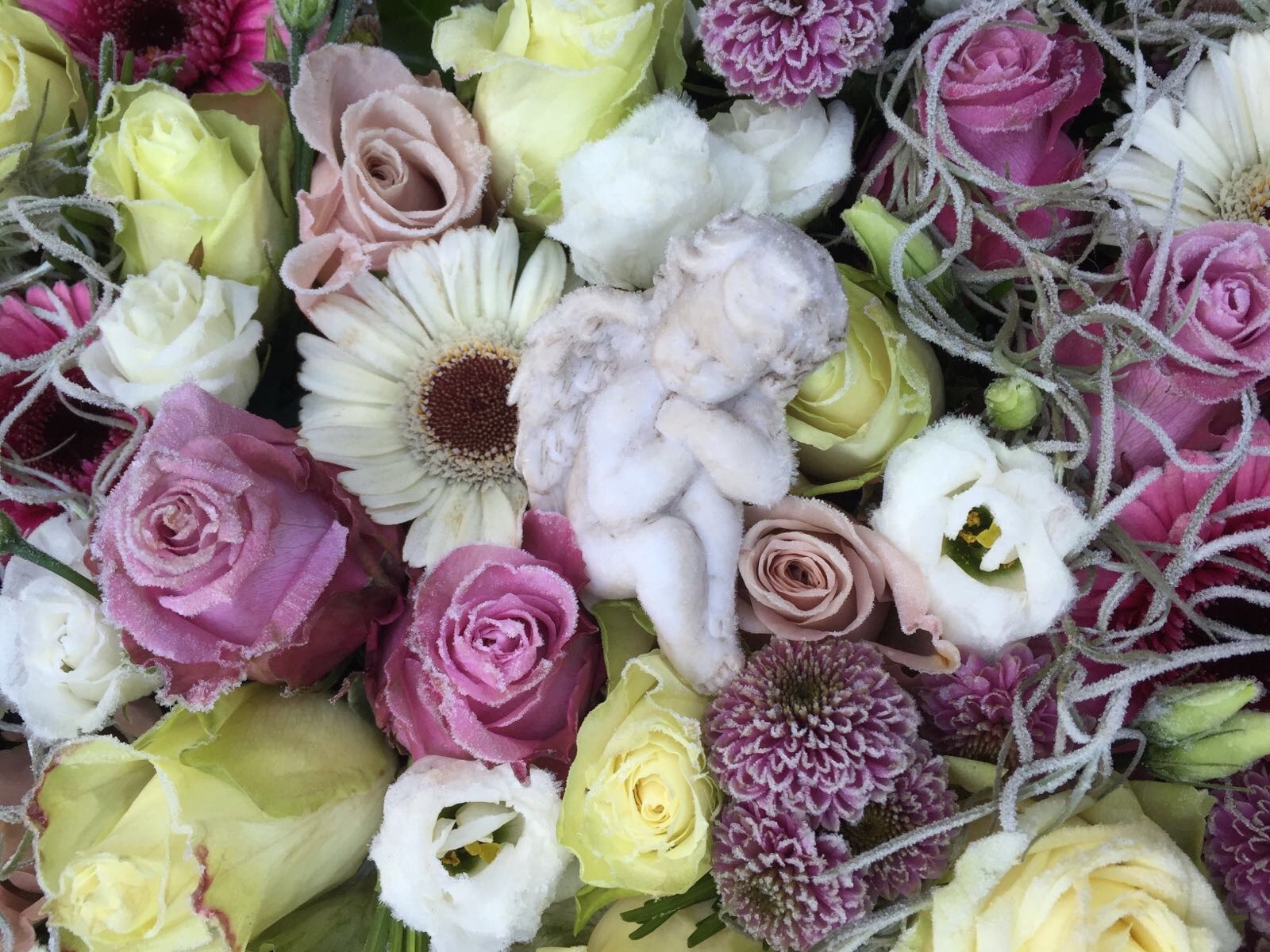 Du schläfst unter einem Meer aus wunderschönen Blumen die über Nacht tief gefroren sind.