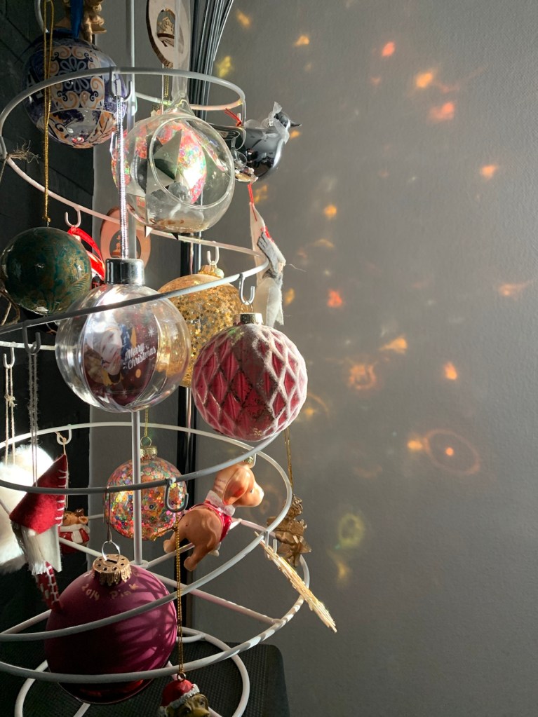 There’s no electric light on the tree. Instead I had the chance to see beautiful lighting earlier this afternoon when sun was falling into the room and made spectacular shadows on the wall.