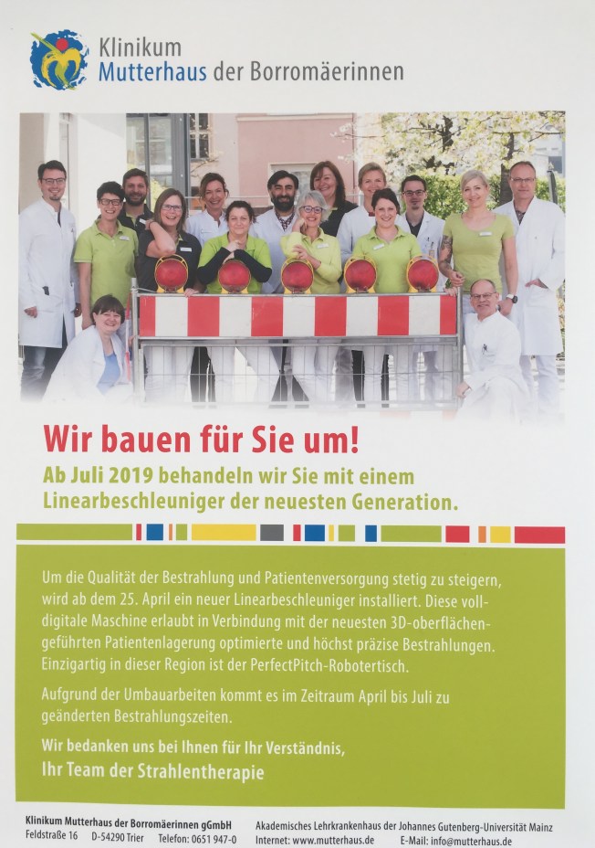 Im Eingangsbereich des Strahlenzentrum hängt ein Poster. Es verrät, dass ab Juli 2019 mit einem Linearbeschleuniger der neuesten Generation behandelt wird.